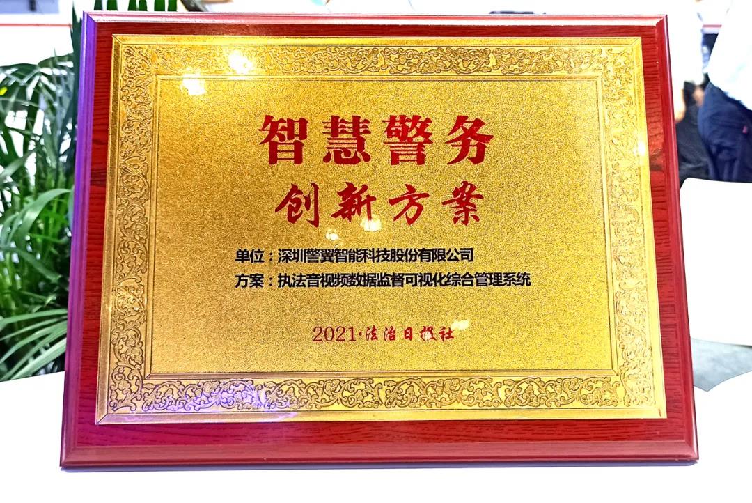 本屆政法展設(shè)置了“2021全國(guó)政法智能化建設(shè)創(chuàng)新案例征集活動(dòng)”,對(duì)近年來在政法智能化有特殊貢獻(xiàn)的產(chǎn)品和企業(yè)予以表彰和肯定。7月27日開展當(dāng)天上午,頒獎(jiǎng)盛典隆重舉行,警翼的移動(dòng)執(zhí)法視音頻解決方案在眾多行業(yè)翹楚中脫穎而出,一舉拿下“智慧警務(wù)創(chuàng)新方案獎(jiǎng)”。